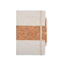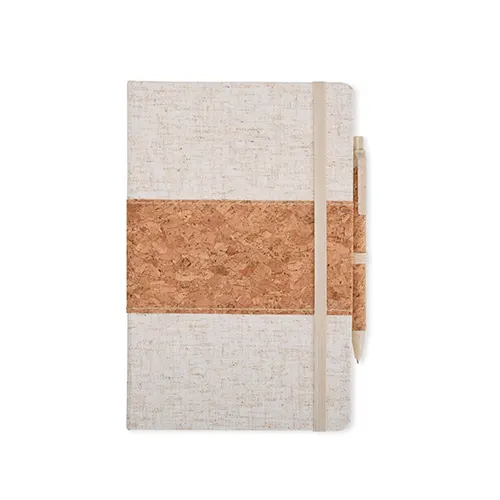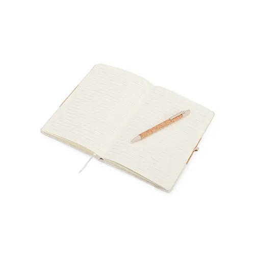 Descrição: Este kit contém uma Caderneta A5 em linho com detalhe em cortiça e suporte para caneta, marcador de página em cetim, aproximadamente 82 folhas com pauta e caneta de cortiça com detalhes em palha de trigo, carga esferográfica azul 1.0mm e acionamento por clique.