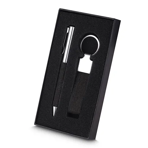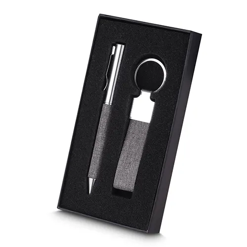 1 Chaveiro em metal com detalhe em RPET reciclável;