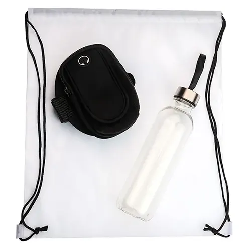 DESCRIÇÃO: Kit boas vindas. Conta com mochila em nylon 420 branca, garrafa pet transparente e braçadeira esportiva para celular.