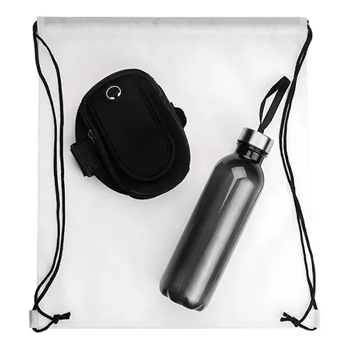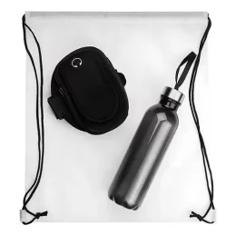DESCRIÇÃO: Kit boas vindas. Conta com mochila em nylon 420 branca, garrafa pet na cor preta e braçadeira esportiva para celular.