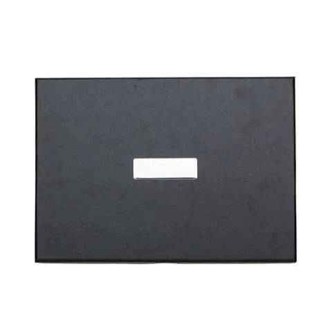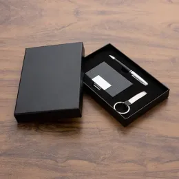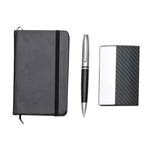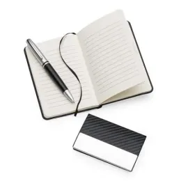 Descrição: Kit executivo 3 peças em estojo de papelão com tampa e parte interna revestida de espuma. Contém: porta cartão de couro sintético texturizado com detalhes prata brilhante, caneta metal fosca com detalhe emborrachado preto, caderneta em couro sintético com aproximadamente 80 folhas amarelas pautadas. Acompanha placa metálica para gravação.