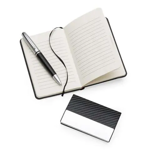 Medidas aproximadas para gravação (CxL): Placa 5,8 cm x 1,9 cm – Porta Cartão 9,3 cm x 2,4 – Caneta 4,5 cm x 1 cm – Caderneta 13,4 cm x 8 cm