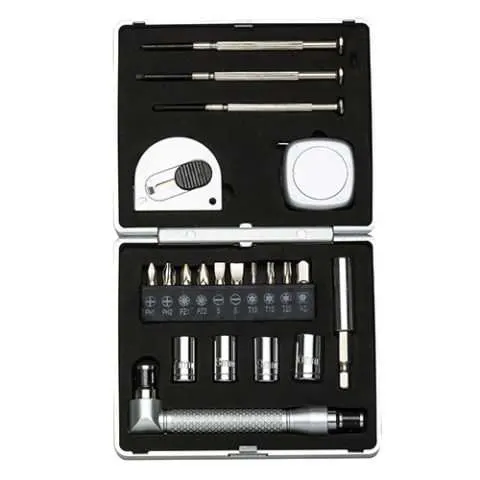 Kit ferramenta 21 peças com caixa de plástico resistente, para abrir basta pressionar botão “push” na parte central. Possui: 3 mini chaves de fenda, trena 1 metro, estilete, conjunto 10 pontas (4 chaves Philips, 2 chaves fenda, 3 chaves torx e um adaptador), 4 extensores bocais (7MM, 8MM, 9MM e 10MM), ferramenta auxiliar e chave que alonga ferramenta.