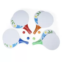 Descrição: Kit frescobol em MDF com embalagem de malha plástica. Contém 2 raquetes de madeira com pegador de revestimento plástico e bolinha emborrachada.