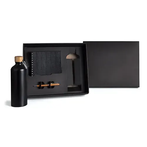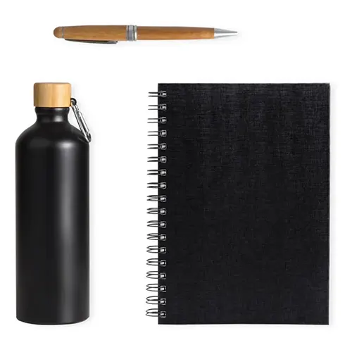 DESCRIÇÃO: Conta com garrafa, caderno para anotações wire-o preto com capa dura e caneta confeccionada em bambu ecológico.