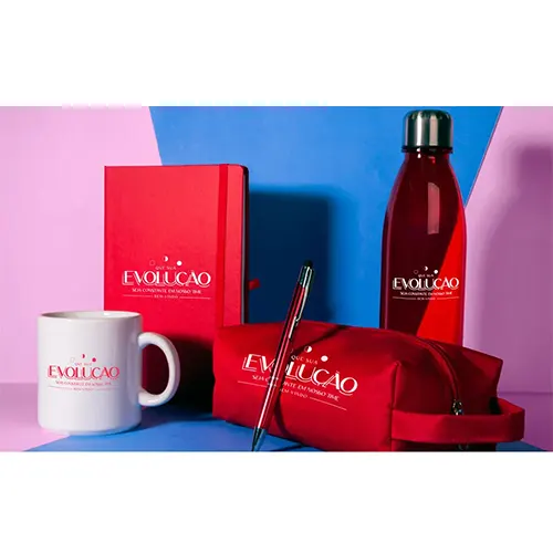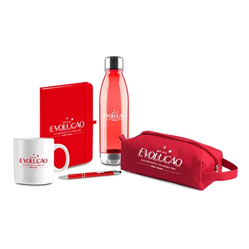 DESCRIÇÃO: Kit composto por Necessaire em Nylon vermelha, garrafa em Policarbonato vermelha, caneca em cerâmica branca, caderno para anotações vermelho com capa dura, caneta esferográfica em alumínio vermelha e protetor para webcam / celular em PP vermelho.