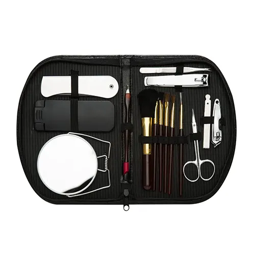 Descrição: Kit manicure 15 peças em estojo de couro sintético com zíper, parte interna revestida com plástico em relevo e elástico para fixação dos itens. Possui: pente, removedor de pelos, espelho duplo, empurrador de cutícula, pinça, cortador de unha, tesoura, mini kit unha 3 em 1(empurrador de cutícula, lixa, limpador de unha), cortador de cutícula e 6 pincéis: blush, sombra, esfumador, côncavo, batom e pente para sobrancelhas.