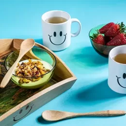 DESCRIÇÃO: Kit para café da manhã. Conta com bandeja e duas colheres em bambu, duas xícaras em cerâmica e duas tigelas de vidro.