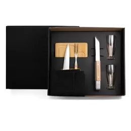 RECOMENDAÇÃO DE PERSONALIZAÇÃO: Uma gravação a Laser na tábua, na faca, no pegador e nos copos.
