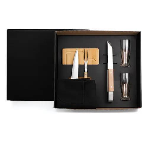 DESCRIÇÃO: Kit para churrasco com pegador. Conta com tábua em Bambu; Faca 7″”, garfo e pegador em aço Inox/Madeira; dois copos de vidro para cerveja; Avental em Brim preto.