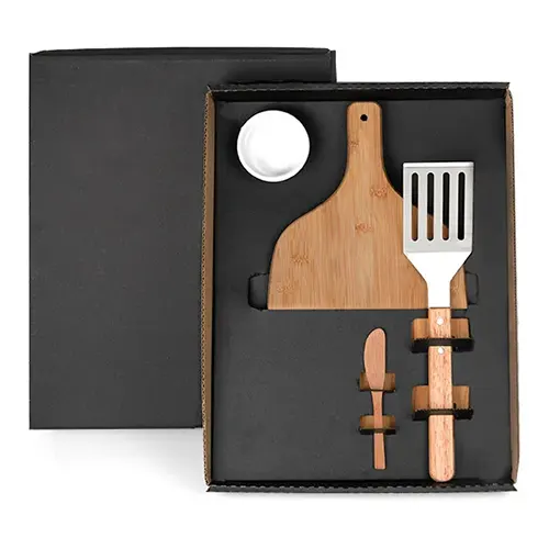 DESCRIÇÃO: Kit para Hamburguer. Conta com tábua e espátula em Bambu; ramekin pequeno; espátula perfurado em aço Inox/Madeira.