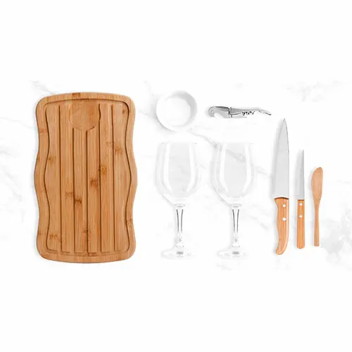 Descrição: Conta com tábua e espátula em Bambu; faca 7″ e faca de mesa em Metal/Bambu; ramekin em Porcelana; duas taças para vinho em Vidro; abridor em Metal. Produto 2 em 1, de um lado da tábua é especifica para cortar pães, do outro é ideal para queijos e petiscos. Estão perfeitamente acomodados em uma caixa para presentear.