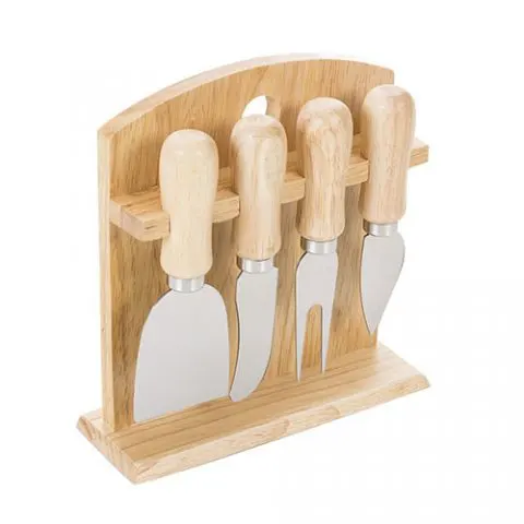 Descrição: Kit queijo com 5 peças em madeira. Contém faca reta, faca com ponta, garfo, espátula e suporte de encaixe com borrachas antideslizantes na parte inferior.