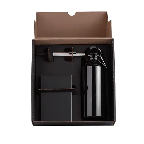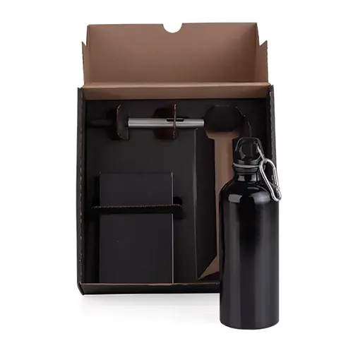 DESCRIÇÃO: Conta com garrafa em alumínio 500ml, bloco para anotações e caneta esferográfica em ABS prata.