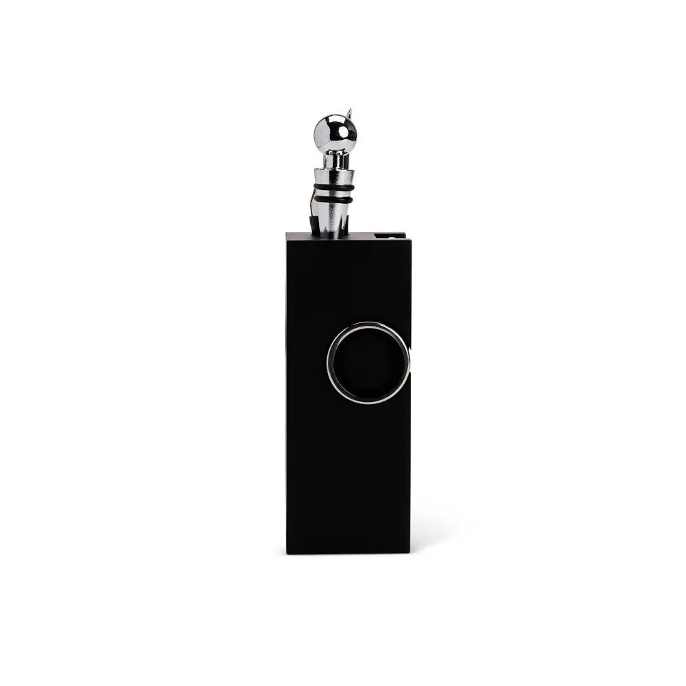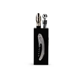 Descrição: Kit vinho com seis peças em inox dispostas em um suporte organizador em MDF. O conjunto contém: tampa de bico, bico condutor com tampa, termômetro, saca-rolhas metálico com lâmina de corte e abridor de garrafa e dois wine collars.