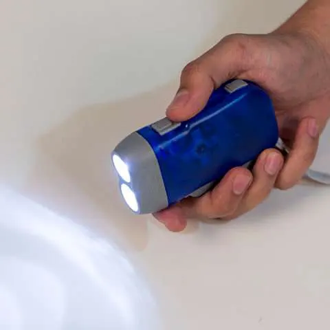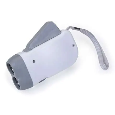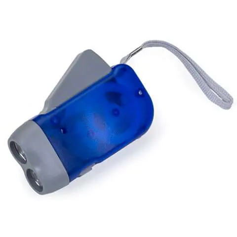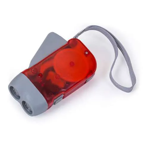 Lanterna plástica com 2 leds, o pressionar do gatilho gera energia para alimentar a lanterna dínamo.