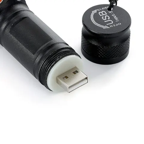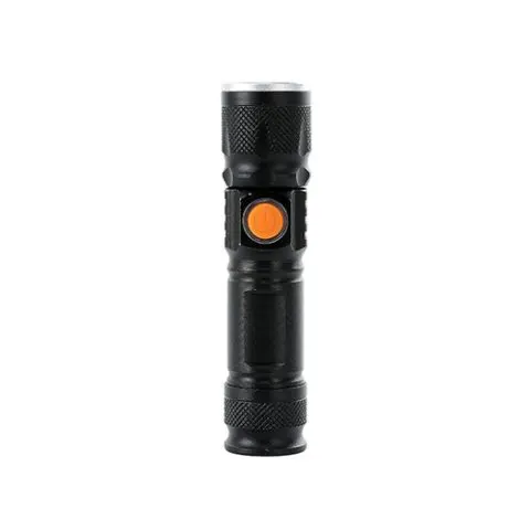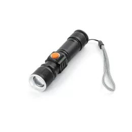 Descrição: Lanterna led recarregável com zoom de regulagem e três estágios de iluminação, material metálico. Acompanha cordão de nylon e cabo USB-V8.