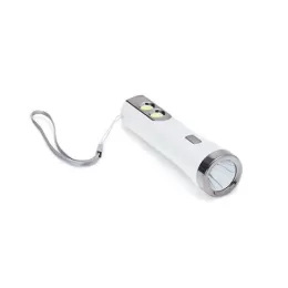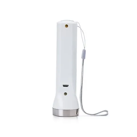 Descrição: Lanterna plástica recarregável de um led com 3 estágios de iluminação e dois leds lateriais com função luminária. Possui cordão de nylon para transporte e acompanha cabo usb.