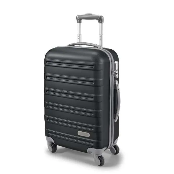 Mala de Viagem Executivo. ABS. Interior forrado, com divisória. 4 rodas giratórias. Pega extensível em alumínio, com mola (altura da pega estendida: 435 mm). Fecho de segurança com senha. Chapa metálica removível para fácil gravação. 350 x 590 x 200 mm | Chapa: 60 x 15 mm