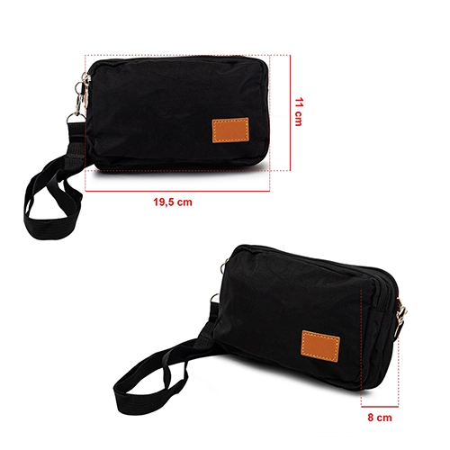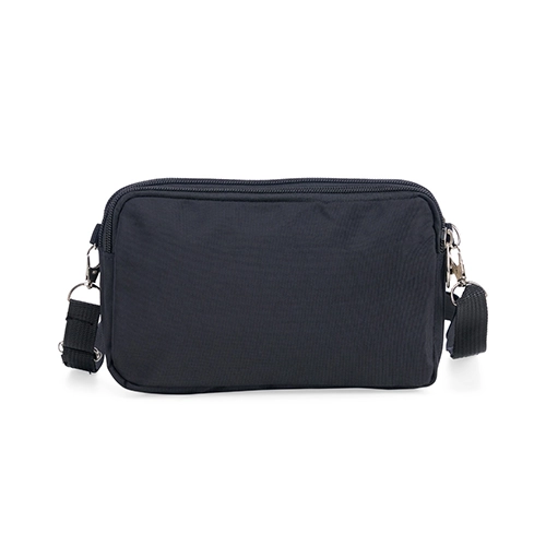 Descrição: Bolsa de ombro em nylon resistente à água, com três compartimentos, alça regulável e etiqueta com espaço para personalização em couro sintético. Executando o papel de ser um bolso extra para guardar e encontrar rapidamente os acessórios do dia a dia.