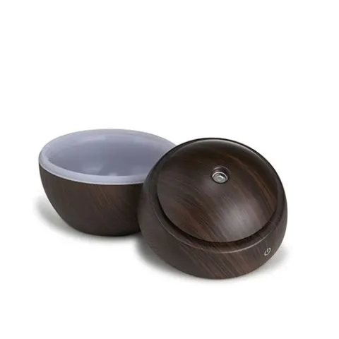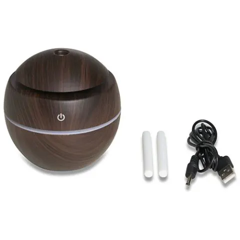 Descrição: Mini umidificador ultrassônico com led que muda de cor. Acompanha filtro de algodão e um cabo USB. Capacidade para 130ml de água. Produzido em plástico e revestido por adesivo caracterizando madeira. Taxa de tensão DC5V e Taxa de consumo de 2W. O produto não retém energia, funciona somente com o cabo USB conectado a um meio de alimentação de energia. Obs.: para conservação do produto é recomendável utilizar água filtrada e não deve ser usado essências!