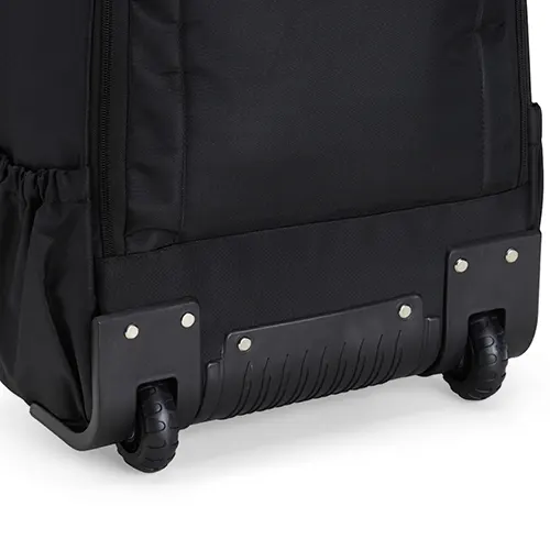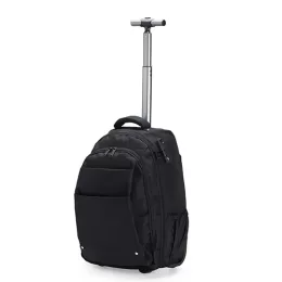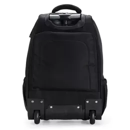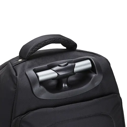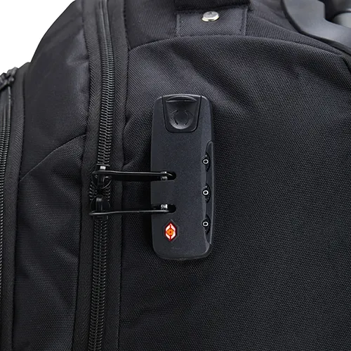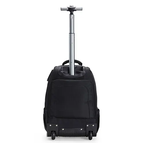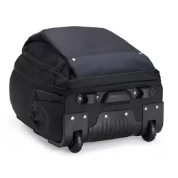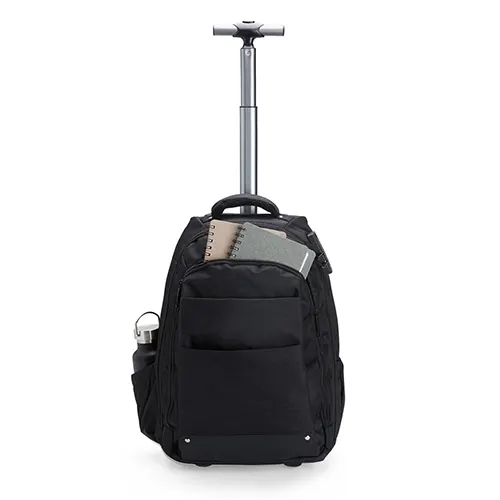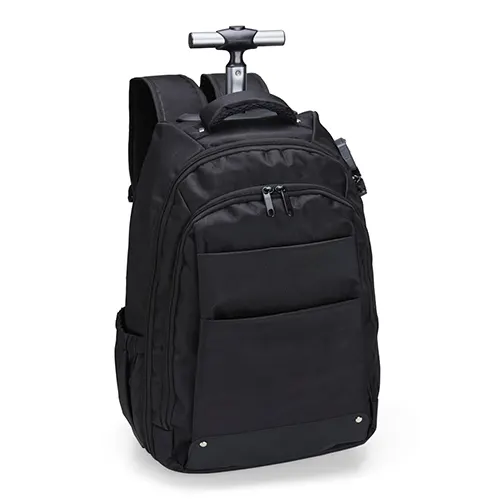 Descrição: Mochila 27 litros com rodinhas e cadeado TSA. Possui padrão para bagagem de mão, conforme especificações ANAC (Agência Nacional de Aviação Civil) Confeccionada em nylon, contém alça revestida com espuma para um maior conforto, puxador retrátil com regulagem e botão acionador, alças para as costas escondidas no compartimento traseiro com zíper. Com 5 compartimentos, sendo um pequeno para carteira e canetas, dois medianos para documentos, bolsos nas laterais, bolso para notebook até 15,6 polegadas com divisórias para celular e forro com zíper. Possui duas rodinhas e freio em plástico, além de um sistema velcro para junção do compartimento das alças com a parte inferior, tampando as rodinhas enquanto transporta a mochila nas costas.