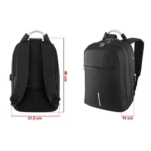 Descrição: Mochila anti-furto com cadeado de segredo. Material de poliéster cinza, tem a parte frontal à prova d’água (respingos). Compartimento principal com bolso para notebook e bolso de tela, parte externa com cadeado de segredo para trava dos zíperes; bolso médio com pequenas divisórias e bolso frontal com fita reflexiva. Possui entrada para fone de ouvido, suporte com entrada USB na parte externa e cabo USB acoplado internamente; permitindo a conexão de um carregador portátil na área interna e a conexão de um eletrônico na área externa, viabilizando a carga e utilização do eletrônico enquanto caminha. Alças para as costas ajustáveis revestidas com espuma para um maior conforto, alça para mãos em metal e alça horizontal para encaixe em malas de viagem. Utilização do cadeado: para criar um segredo pressione e segure o botão, crie a numeração desejada e em seguida solte o botão para assumir a codificação criada, repita o mesmo processo sempre que necessitar fazer alguma alteração.