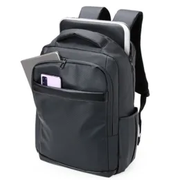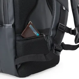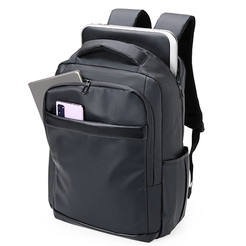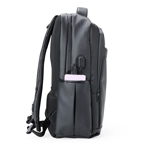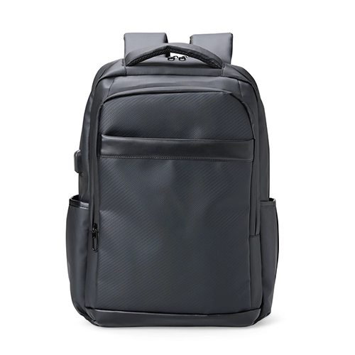 Descrição: Nossa mochila de 39 litros combina funcionalidade e conforto! Feita em couro sintético resistente à água e com design inteligente, é perfeita para impressionar no mundo corporativo. Conta com quatro compartimentos estratégicos: um frontal, outro com bolsos e divisórias para documentos e canetas, um compartimento antifurto para proteger os itens mais valiosos e um principal, com espaço para notebooks de até 15,6″ e entrada para cabo USB. Além disso, possui plaquinha para personalização exclusiva, dois bolsos laterais, alças reguláveis e acolchoadas que distribuem o peso de forma equilibrada, acabamentos refletivos e uma parte traseira acolchoada, garantindo mais conforto. Para completar, conta com engate para malas de viagem, sendo a parceira ideal além do dia a dia do trabalho. Acompanha plaquinha metálica personalizável.