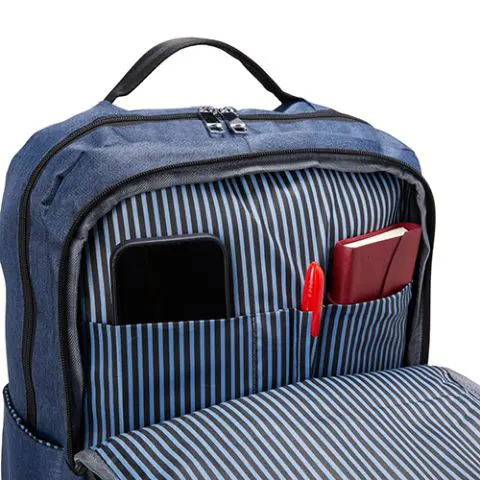 Descrição: Mochila de nylon 26 Litros com detalhes em couro sintético e quatro compartimentos, sendo o principal com bolso para notebook 15,6. Com divisórias internas para acessórios, a mochila possui bolso lateral, suporte externo USB e alça para engate em malas de viagem.