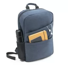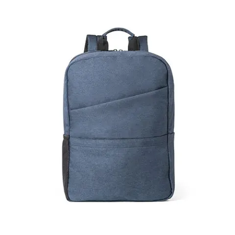 Mochila para notebook em rPET 600D com alças almofadadas. O compartimento principal tem 2 divisórias almofadadas para notebook até 15.6” e tablet até 10.5”. Contém dois bolsos com fecho na parte frontal e um bolso lateral em rede com elástico. Parte posterior almofadada com banda para transporte em trolley. 300 x 420 x 110 mm