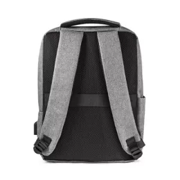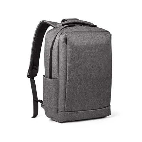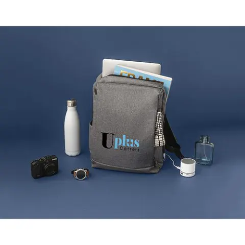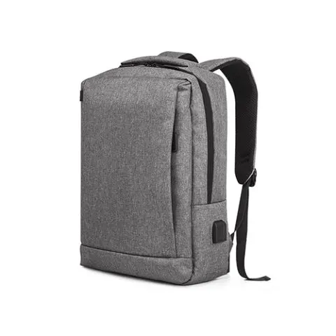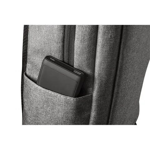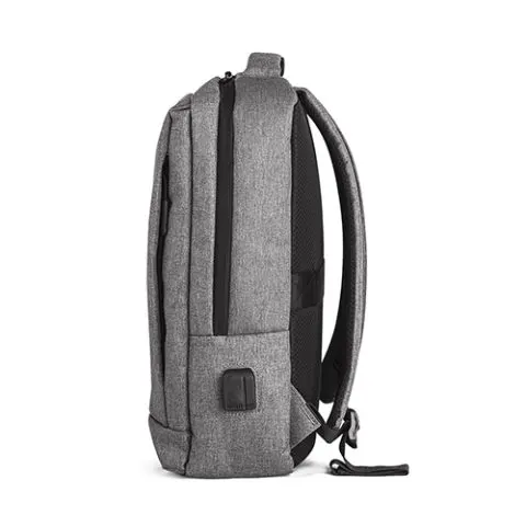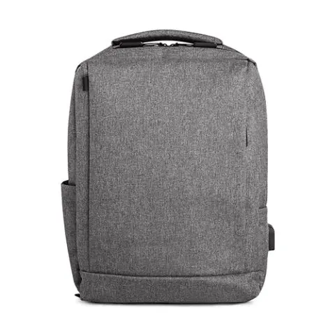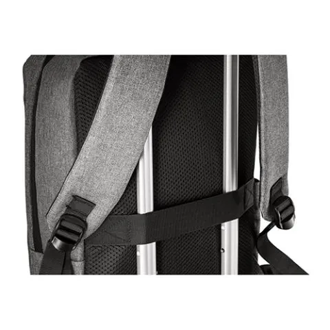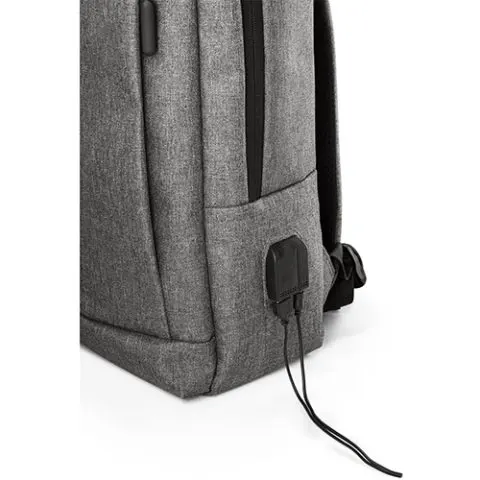 Mochila para notebook em 300D com 1 compartimento principal com 2 bolsos forrados para computador 15,6” e tablet 10,5 e diversos bolsos interiores. Inclui banda para transporte em trolley, bolso frontal, bolso lateral e entradas USB e Jack 3,5mm. Parte posterior e alças são almofadadas. 320 x 410 x 120 mm