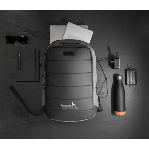Mochila para notebook em 300D com placa de metal preta personalizável e 2 compartimentos principais. Os 2 bolsos almofadados são compatíveis com computador até 17″ e com um tablet de 9,7″. Tem ainda mais 2 bolsos nas alças (1 com zipper), bolso oculto nas costas da mochila com zipper, bolso no topo com zipper e bolso aberto na lateral com entrada USB. Contém ainda tira de transporte para trolley e alças e parte posterior almofadadas. 310 x 480 x 130 mm