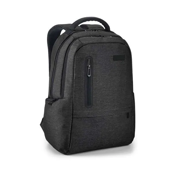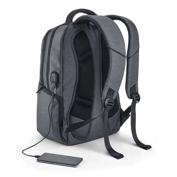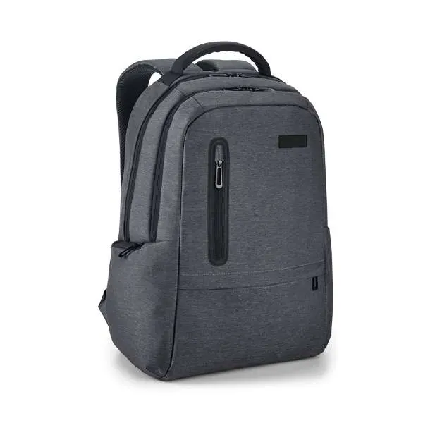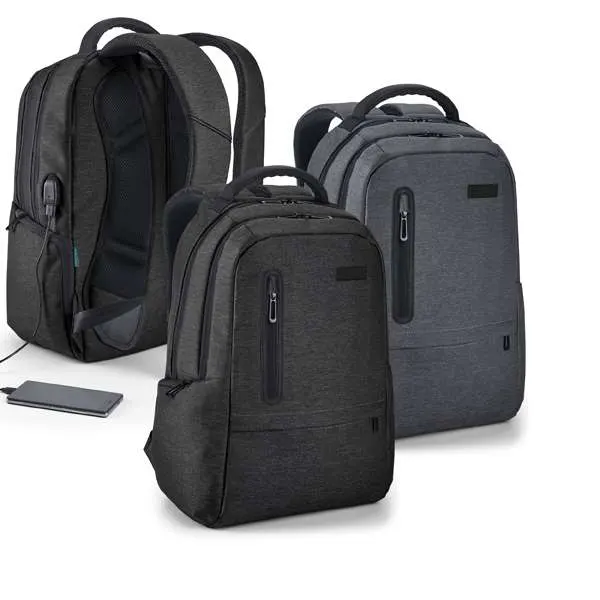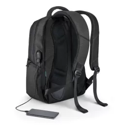 Em Nylon 2Tone impermeável. Com 2 compartimentos. Compartimento posterior forrado, com bolso interior com zíper e divisória almofadada para notebook até 17”. Compartimento frontal forrado, com diversos bolsos interiores. 2 bolsos frontais e 2 bolsos laterais. Com porta USB e cabo USB/micro USB para ligar a dispositivos móveis (bateria portátil não inclusa). Parte posterior almofadada, com sistema de apoio acolchoado para as costas e alças almofadadas. Placa metálica removível com imã, para fácil gravação. 310 x 470 x 200 mm | Placa: 50 x 20 mm