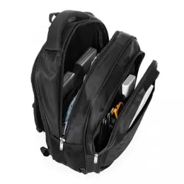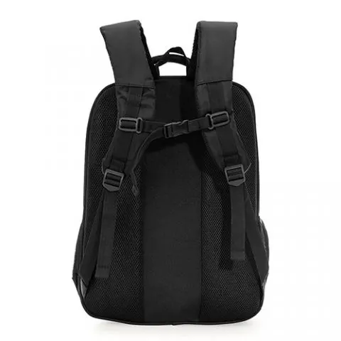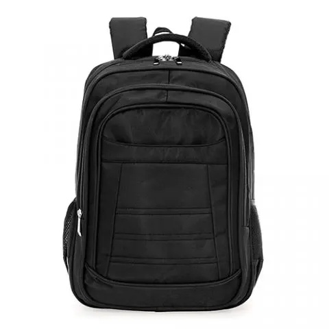 Descrição: Mochila confeccionada em poliéster de alta qualidade com compartimento principal com bolso para notebook 15.6 polegadas, compartimento mediano com bolso para documentos e canetas, compartimento frontal com bolso de velcro e bolsos laterais em malha. Contém zíperes prata, alças para costas ajustáveis com regulagem peitoral e parte traseira com revestimento anti-transpirante, possui duas alças de mãos em nylon, sendo uma delas com revestimento interno.