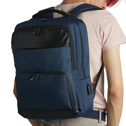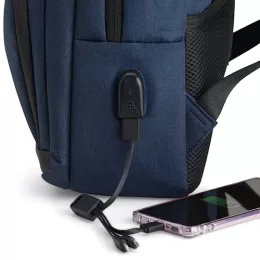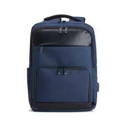 Descrição: Mochila de Poliéster 29 litros com detalhes em couro sintético. A mochila possui 4 compartimentos, sendo o principal com bolso para notebook 15,6 polegadas. Contém divisórias internas para acessórios, bolso lateral, alça para engate em malas de viagem e suporte externo USB.
