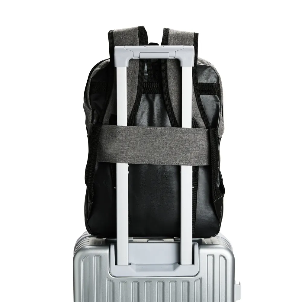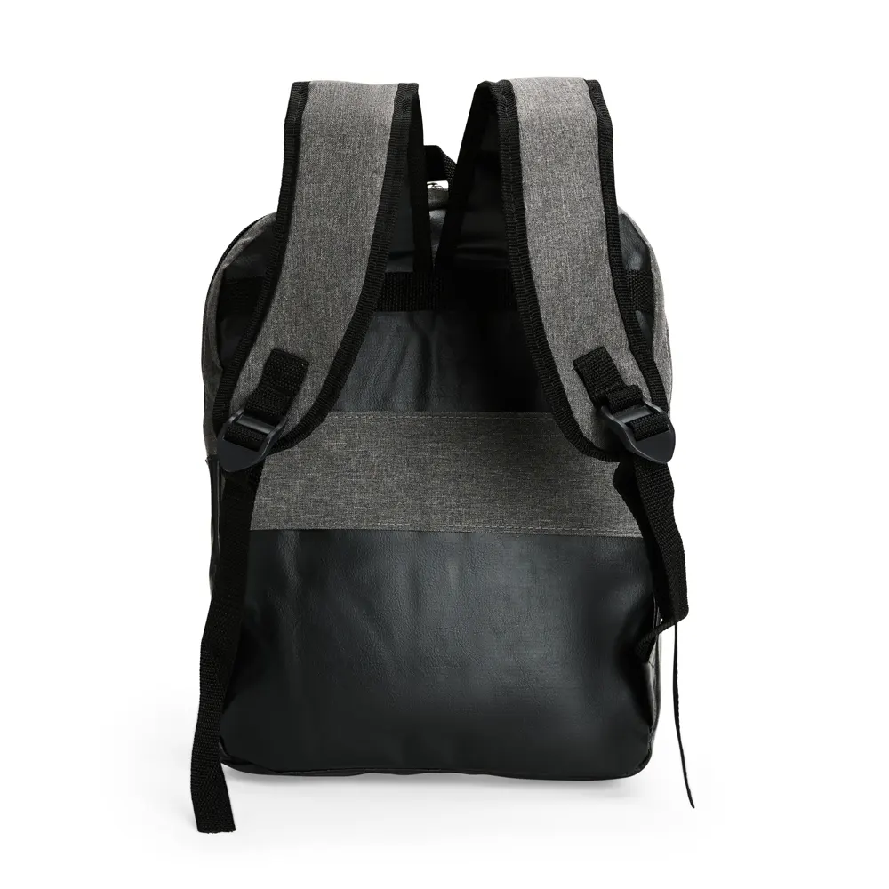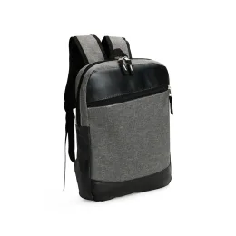 Descrição: Mochila confeccionada em Poliéster PVC mescla com detalhes em couro sintético e capacidade de até 11 litros. Apresenta divisória interna em tecido telado respirável, ideal para notebooks de até 14 polegadas. Possui compartimento frontal com fechamento em zíper, duas alças para as costas, uma alça de mão e engate posterior para malas de viagem.