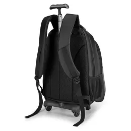 Mochila Trolley para Notebook. Nylon 999. Material à prova de água. Compartimento principal almofadado para notebook até 17”. Segundo compartimento forrado e com diversos bolsos. Bolso frontal com zipper e bolsos laterais com tela. Com estrutura removível e 2 rodas. Pega extensível em alumínio, com mola (altura da pega estendida: 550 mm). Chapa metálica removível com ímã para fácil gravação. 350 x 460 x 210 mm | Chapa: 50 x 20 mm