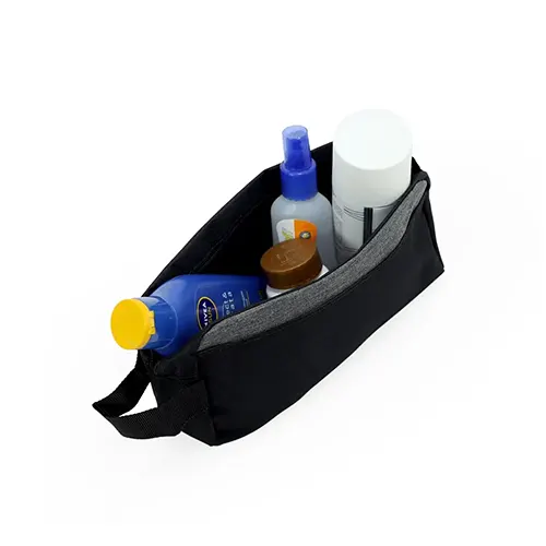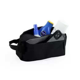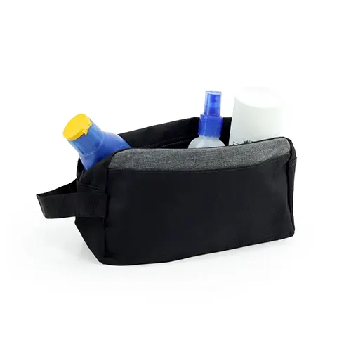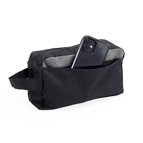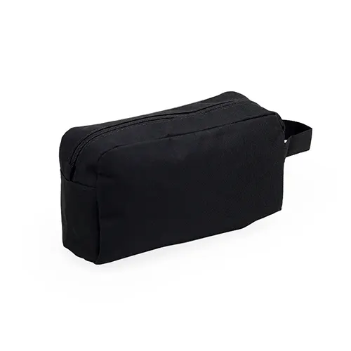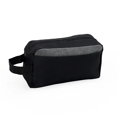 Nécessaire de nylon com alça lateral e compartimento frontal.