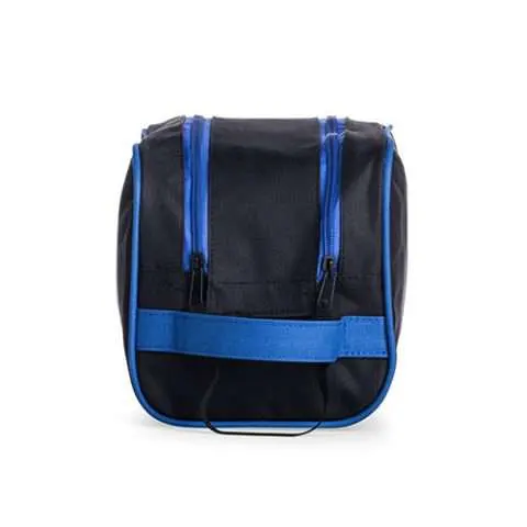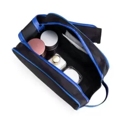 Descrição: Necessaire de poliéster com alça lateral e dois zíperes com cordão interligado. Possui um bolso interno.