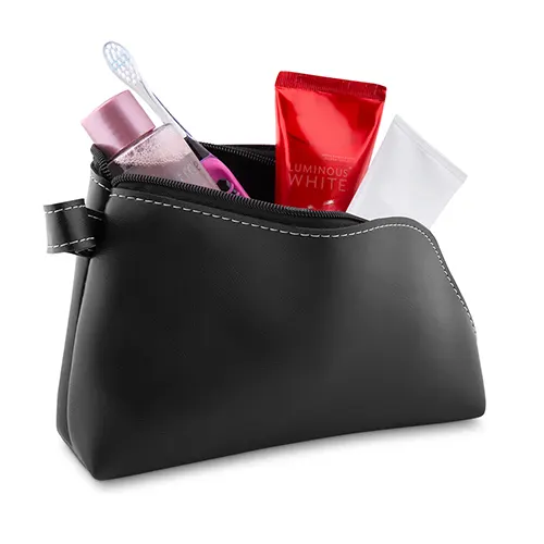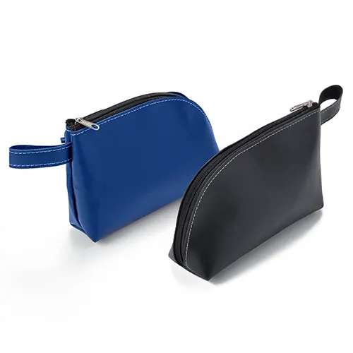 Nécessaire em PU no tecido externo e forro em sintético Bidim com alça lateral. Gravação frontal na opções: serigrafia e plaquinha.