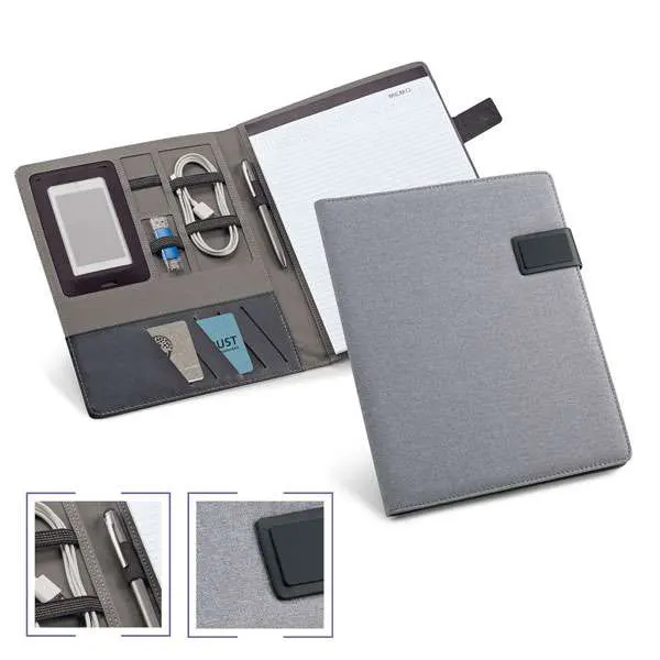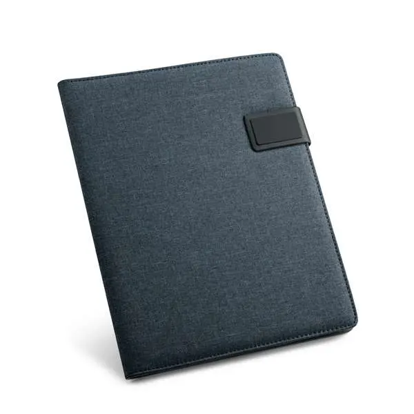 Pasta A4 em Linho Sintético e Couro Sintético. Fecho magnético. Bloco: 20 folhas pautadas. Chapa metálica com acabamento emborrachado. Esferográfica e pen drive não inclusas. 233 x 310 x 18 mm | Chapa: 50 x 30 mm