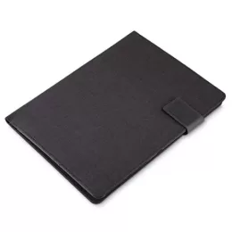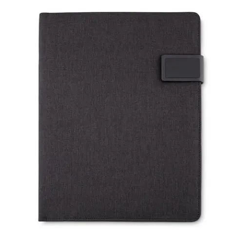 Descrição: Pasta convenção de tecido sintético, possui fecho magnetizado com plaquinha para personalização em preto fosco. Parte interna com compartimento grande para arquivar documentos,três divisórias elásticas, duas divisórias para celular e cartões, suporte elástico para caneta e bloco com aproximadamente 20 folhas brancas pautadas com dias do mês na área superior.