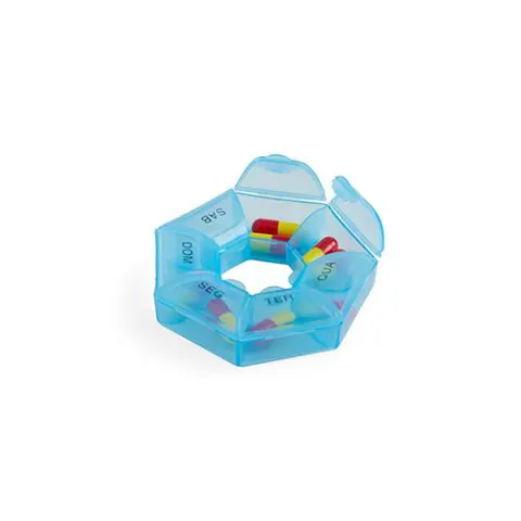 Descrição: Porta comprimidos semanal, feito em plástico.