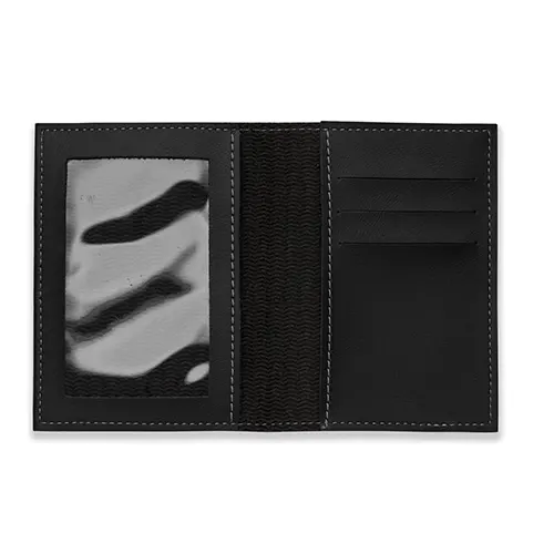 Descrição: Porta-documento Bidins em couro sintético, capa frente e verso lisa, parte interna com bolso de visor plástico e três divisórias no próprio couro com bolso lateral.