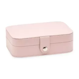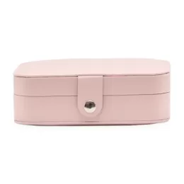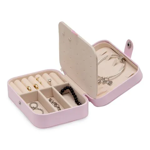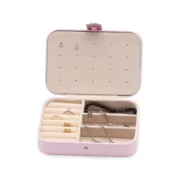 Descrição: Porta joias de couro sintético com revestimento aveludado. Possui compartimentos internos para anéis, pulseiras, colares e placa para brincos.
