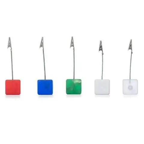 Descrição: Porta recado jacaré colorido com cabo metal , formato quadrado com bordas arredondadas e feito de resina.