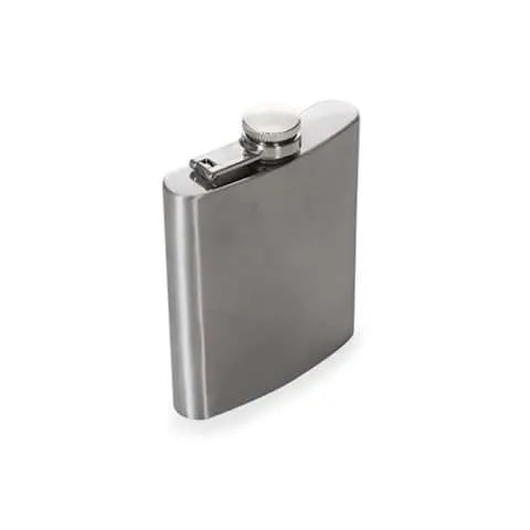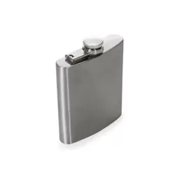 Porta whisky de inox com capacidade 7oz, tampa de rosca sustentada por suporte na lateral superior.