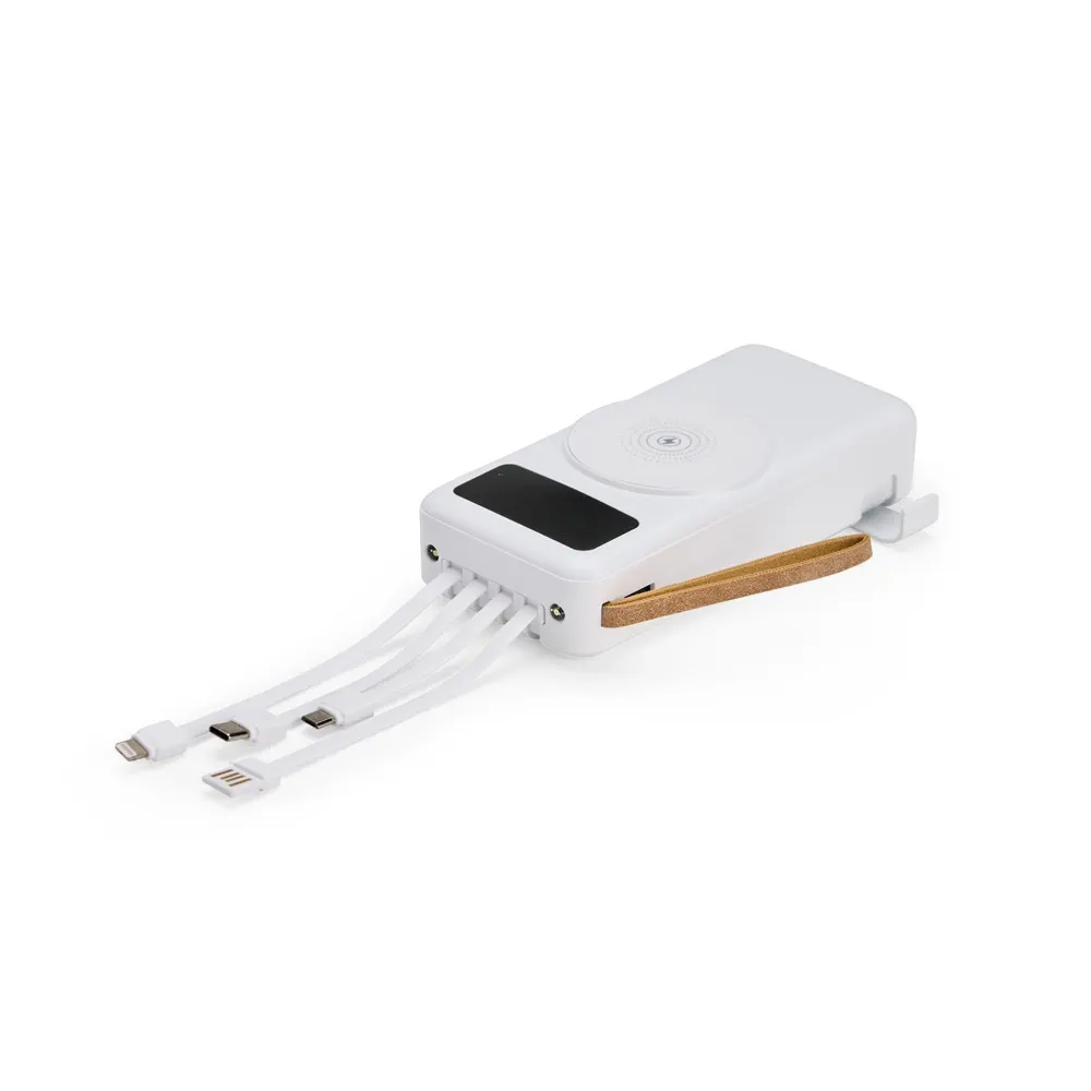 Descrição: Power Bank em plástico com capacidade de 10.000mAh. Possui quatro cabos integrados com saídas para Lightning, USB-C, Micro-USB e USB, além de área de recarga por indução magnética para dispositivos compatíveis e lanterna de LED. Conta ainda com entradas USB-A e USB-C para recarga do próprio aparelho e alça de tecido sintético para transporte.