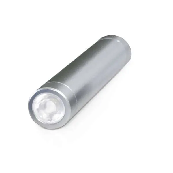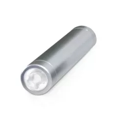 Power Bank de Alumínio com lanterna e bateria de lítio. Capacidade: 2600 mAh. Tempo de vida ≥ 500 ciclos. Com entrada/saída 5V/1A. Incluso cabo USB/micro-USB para carregar a bateria.