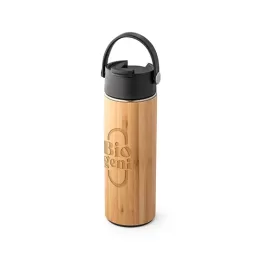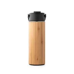 Squeeze em bambu e aço inox com corpo duplo, isolamento a vácuo e tampa em PP. Capacidade até 440 ml. Food grade. Fornecido em caixa presente de papel craft. ø70 x 222 mm